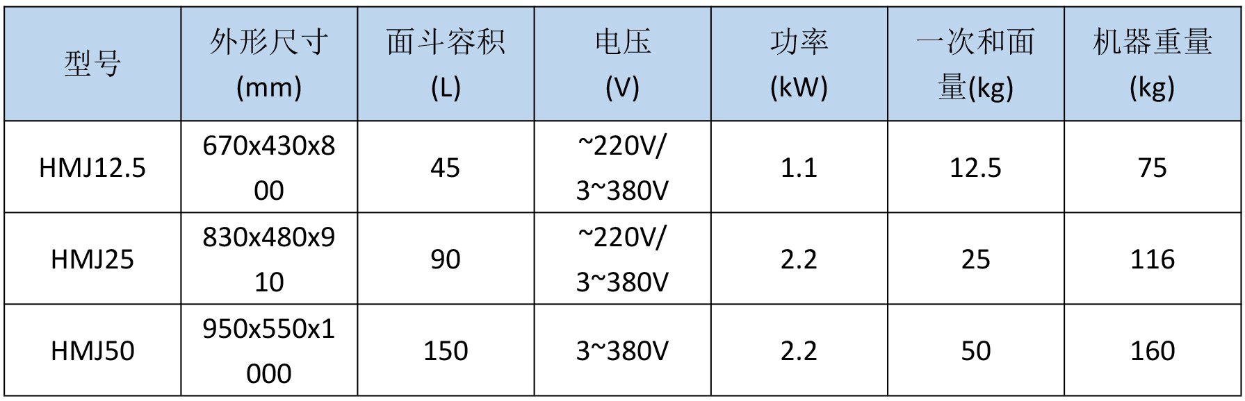 HMJ12.5、25、50和面機(jī)屬于臥式和面機(jī),將定量的面粉、水(建議面水比例1:0.4~1:0.45)及其它輔料混合均勻,并制作成面團(tuán)的炊事機(jī)械,主要為制作饅頭、包子、餃子和面包等準(zhǔn)備面團(tuán)。