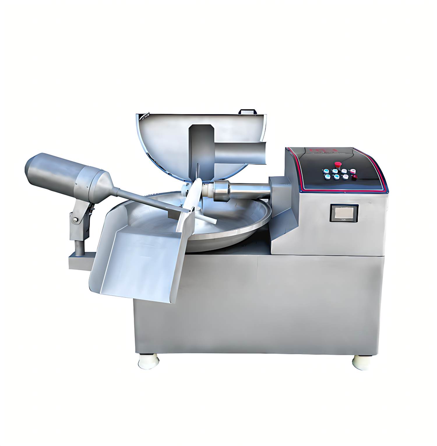 整機(jī)不銹鋼外殼包覆料盆及其上蓋、刀軸等均采用304不銹鋼材料精工制造而成!三電機(jī)配置,切刀、料盆和出料分別單獨(dú)控制,互不影響,自動(dòng)出料;該機(jī)設(shè)計(jì)合理,結(jié)構(gòu)緊湊,外形美觀,易于維護(hù)清洗,使用它不僅能將各種肉塊碎肉、板油等進(jìn)行精細(xì)切碎,還可以將其它原料如蔬菜、水果、冰屑、湯汁以及調(diào)味科等輔材與肉沫一起進(jìn)行充分混合,攪拌均勻;標(biāo)配緊急停止按鈕和YZW耐油橡套電源線,安全可靠。