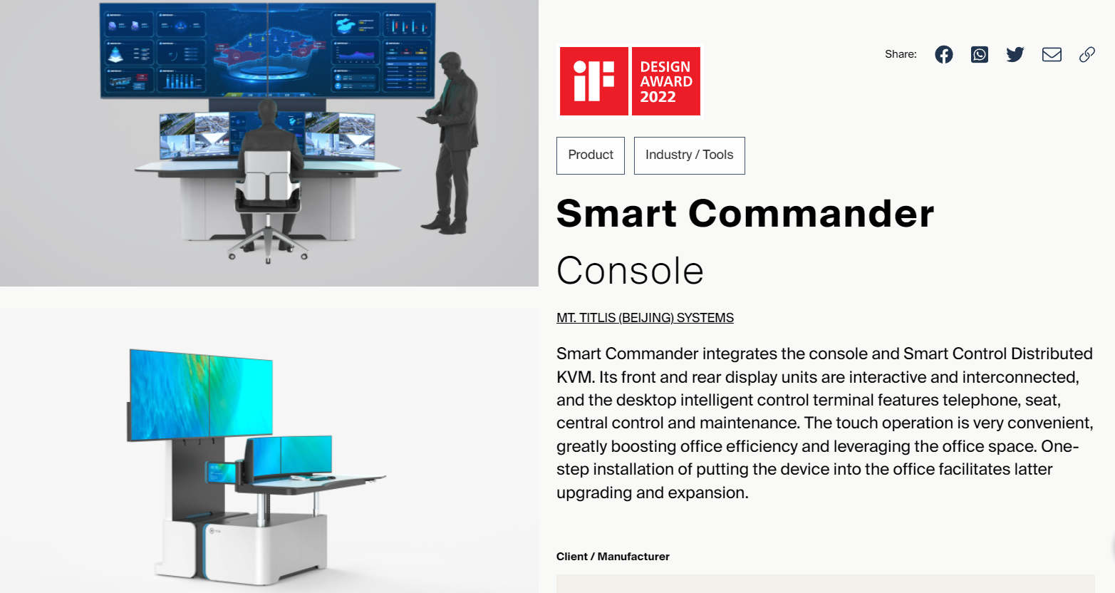近日,被譽為工業(yè)設(shè)計界“奧斯卡”的德國iF設(shè)計大獎?wù)浇視裕?/span>鐵力山“智慧指揮官”和Smart control智控協(xié)作系統(tǒng)“兩大產(chǎn)品從近萬件作品中脫穎而出,得到來自各個領(lǐng)域的國際知名設(shè)計師對其原創(chuàng)力、科技性、智慧體驗等方面的一致認(rèn)可,將IF設(shè)計大獎攬入囊中!