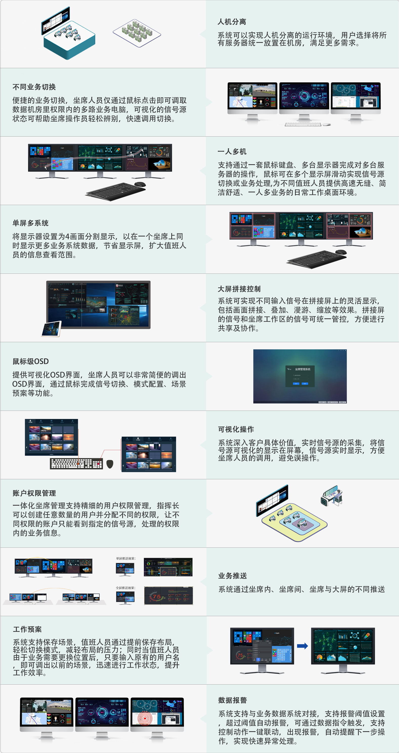 信號切換時,可以做到無延時、無黑場、無藍屏、無閃屏等中間過渡態(tài),瞬間完成切換。操作員需要查看或操作某個服務(wù)器信號時,無需等待,瞬時顯示視頻、數(shù)據(jù)信息。