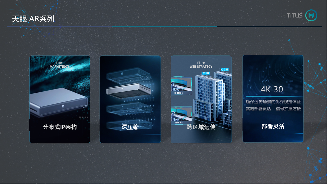 天眼AR系列采用分布式傳輸組網(wǎng)方案,具備高可靠的“無(wú)服務(wù)器純分布式架構(gòu)”, 以千兆交換網(wǎng)絡(luò)為載體,低成本、高可靠。視頻流采用H.264/H.265深壓縮編解碼技術(shù),大幅減少了帶寬資源的占用,實(shí)現(xiàn)海量信號(hào)大規(guī)模組網(wǎng)融合調(diào)度、信息發(fā)布、跨地域音視頻信號(hào)的傳輸處理和共享。
