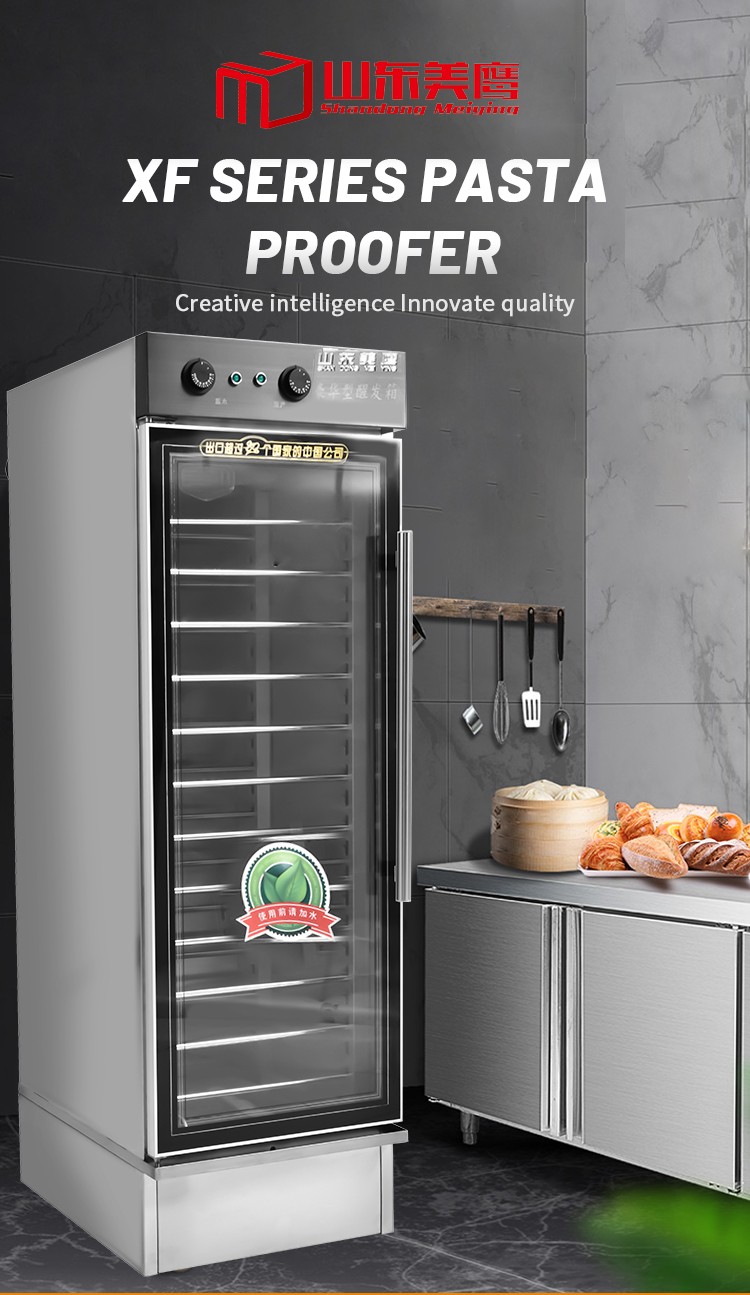 利用發(fā)熱元件對(duì)水和空氣進(jìn)行加熱、使其產(chǎn)生相對(duì)濕度為80-85%RH溫度為35℃-45℃的氣溫,面包胚再該環(huán)境中完成二次發(fā)酵過(guò)程。產(chǎn)品整體結(jié)構(gòu)采用優(yōu)質(zhì)無(wú)磁不銹鋼板材,堅(jiān)固耐用,清潔衛(wèi)生。
